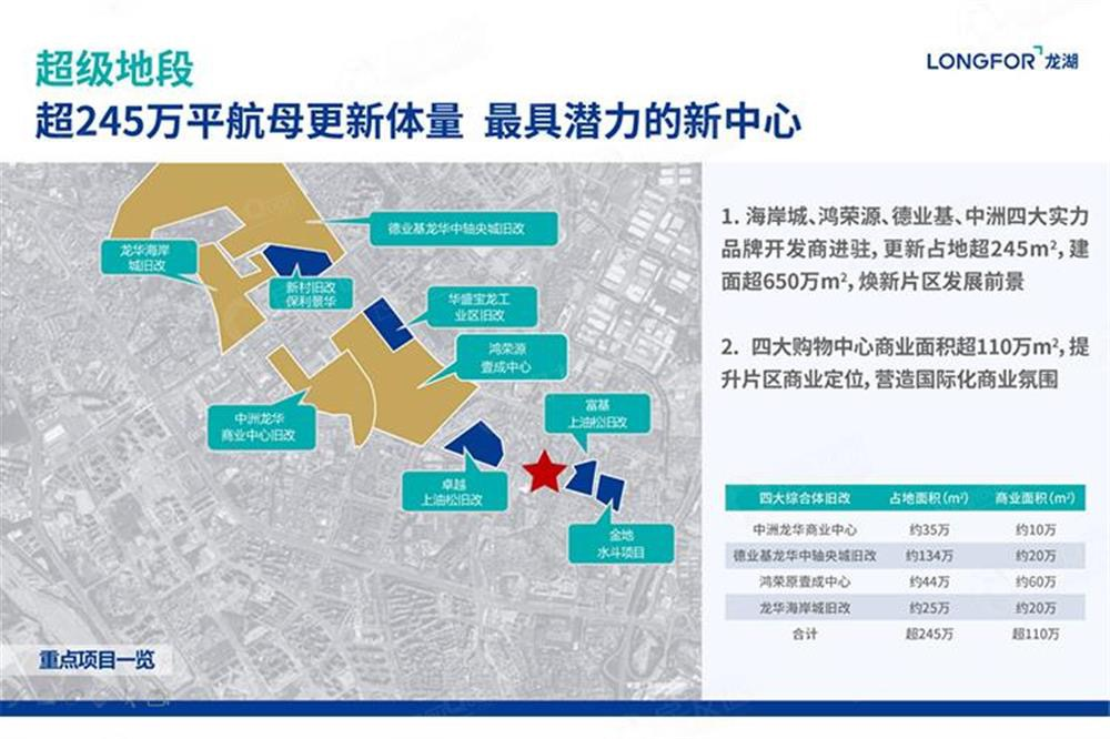 粵港澳大灣區(qū)中軸,深圳地理中心,龍華中心地段。政府約2000億元投資,近2.5倍福田中心區(qū)規(guī)模,超60個標志性重大項目,打造集高端商務、現代商貿、金融服務于一體的國際會客廳。片區(qū)規(guī)劃更新面積超245萬㎡,建面超650萬㎡,中洲、海岸、德業(yè)基、鴻榮源四大購物中心超110萬㎡集中商業(yè)建面,周邊規(guī)劃綜合體林立,定鼎深圳未來最大商圈;